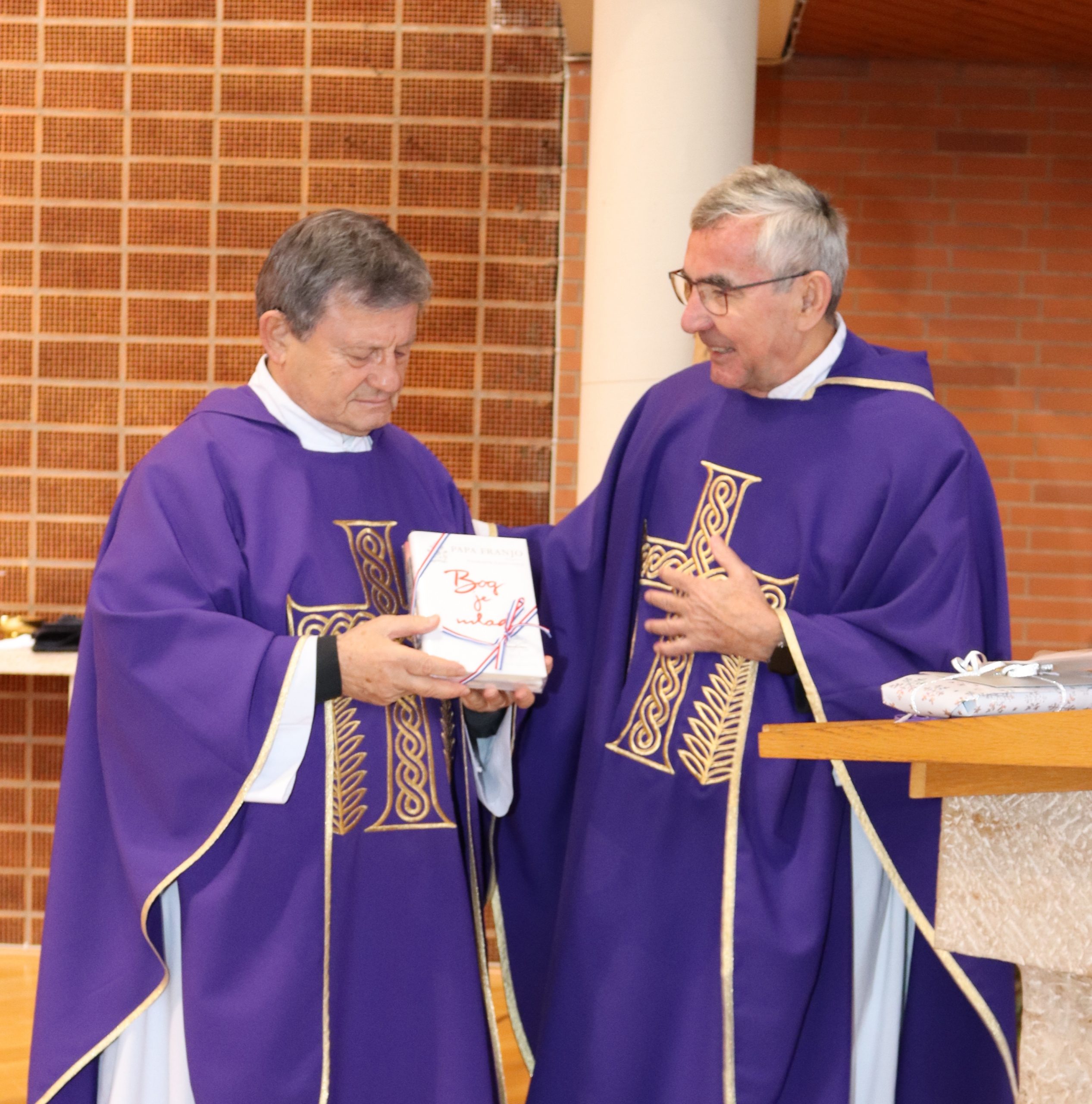 Uz dirljive riječi i prigodne darove od vlč. Ivana Levaka su se uime vjernika misije oprostile sestre Marilena i Nina i brat Antonio Laganga. „Imati Vas, vlč. Ivane, bio je za nas veliki dar na kojemu smo Vam od srca zahvalni. Kakvi ste bili na početku, takvi ste ostali do kraja. Zahvalni smo Bogu da smo Vam mi povjereni, a zahvalni smo i onima koji su Vas baš nama poslali. Za vas počinje jedno novo životno razdoblje koje neće biti opterećeno s puno obveza, ali znamo da iz Vaših misli i Vašeg sjećanja neće biti izbrisana ova zajednica koju ste držali na okupu i kojoj ste s ljubavlju služili 32 godine. Cvijeće koje Vam dajemo, znak je naše zahvalne ljubavi za sve dobro koje ste nam činili i darovali. U prošlu srijedu proslavili ste 74. rođendan. Taj je dan ujedno i svetkovina Majke Božje – Bezgrješno začeće. U tom znaku, darujemo Vam štolu s marijanskim oznakama. Gdjegod bili neka Vas podsjeti na ovu našu zajednicu“, kazala je Marilena Langanga, koja je ujedno srdačnu dobrodošlicu uputila novom dušobrižniku vlč. Ivanu Penavi. „Dragi fra Ivane, uime zajednice vjernika Hrvata, katolika iz Hrvatske i Bosne i Hercegovine u Aschaffenburgu srdačno Vas pozdravljam kao našeg novog dušobrižnika. Stanovat ćete u Würzburgu, ali će nas služenje Bogu i jednih drugima činiti bližima. Radujemo se svemu onome što nam po Vama dolazi te Vam želimo radost i uspjeh u radu s povjerenim Vam vjernicima.“