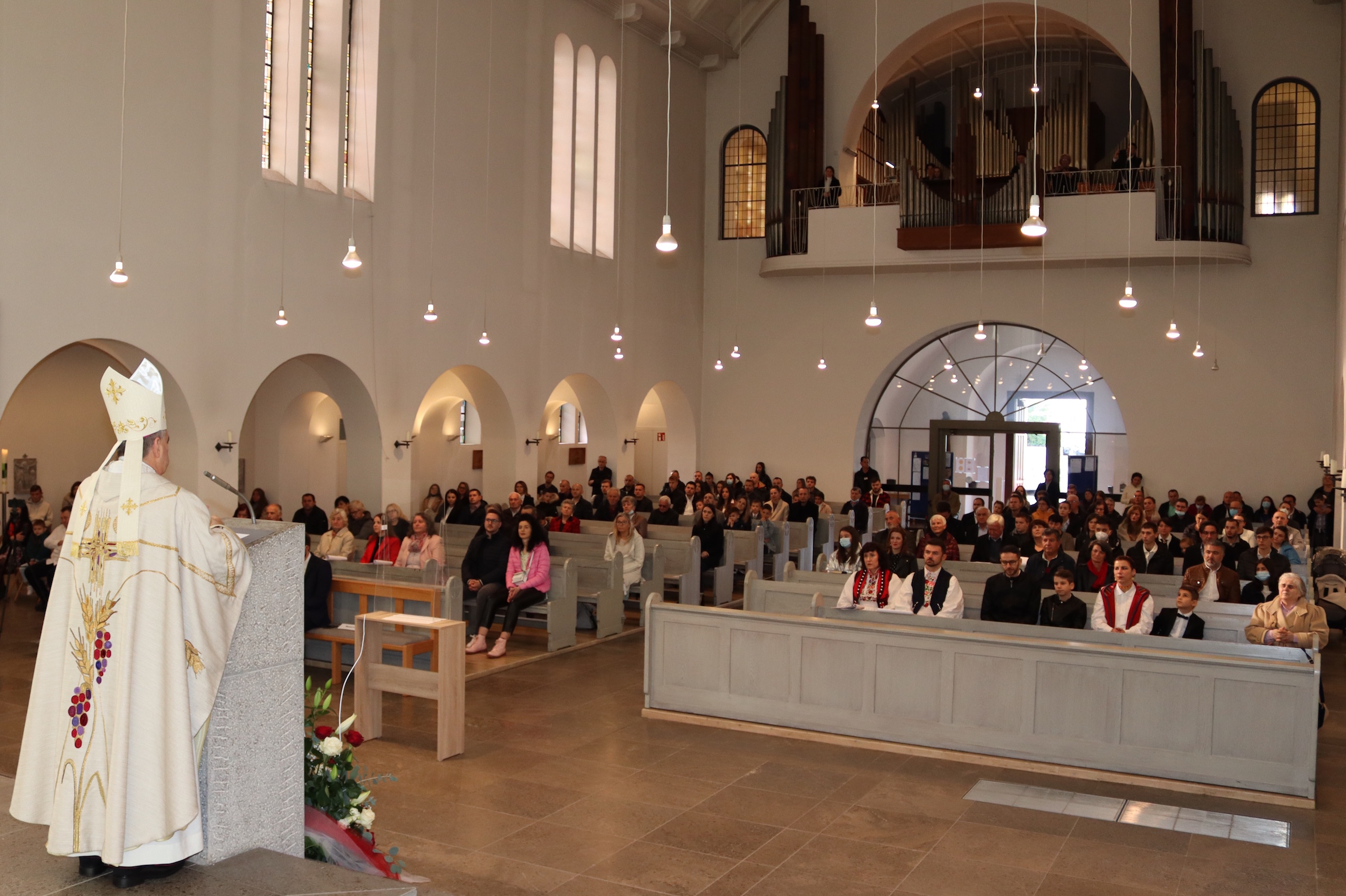 Mons. Eterović je podsjetio kako je Katolička Crkva zajednica svih naroda i jezika i svi je obogaćujemo svojim posebnostima. „Dakle, integracija da – asimilacija ne. Upravo naše hrvatske katoličke misije služe u Crkvi da se osjećate svoji na svome, ovdje u Njemačkoj ili u drugim zemljama sa svojom bogatom kršćanskom katoličkom kulturom i da na taj način obogaćujete i Katoličku Crkvu u Njemačkoj, osobito u ovo izazovno vrijeme. Što nam donosi budućnost – to ne znamo. Zanimljivo je kad pogledamo oko nas da su postojale i postoje još uvijek pojave povratka u domovinu odakle su ljudi došli u Njemačku. Recimo, na tisuće Poljaka se nakon ´Brexita´ vrtilo u Poljsku, kad se Poljska počela razvijati i stvarati radna mjesta, a čujem da se dobar dio Poljaka također i iz Njemačke vraća u Poljsku. To je primjer, pa se nadam da kad se i Hrvatska i Bosna i Hervegovina budu razvijale u svim prvcima, da će se stvoriti uvjeti – ekonomski, kulturni i duhovni i da će vam biti ne samo drago nego i ekonomski isplativo vrtiti se, barem neki, na svoje korijene u svoju domovinu. Pritom postoje brojne mogućnosti. Ljubav je kreativna.“ Na kraju je mons. Eterović još jednom podsjetio kako je srž kršćanstva u ljubavi prema Bogu i bližnjemu. „Gdjegod živjeli to nastojte ostvarivati, bilo ovdje u Njemačkoj, bilo da odete u neku drugu zemlju, bilo da se vratite u svoju domovinu. Tu ljubav možemo ostvariti kao što su ostvarili brojni naši sveci ne samo iz prvih kršćanskih vremena, ne samo iz Srednjega vijeka, iz moderne povijesti, nego i iz naših suvremenih društveno-političkih prilika. Jedan od lučonoša je te svetosti bl. Alojzije Stepinac, koji je simbol naše mučeničke prošlosti, ali također i zalog svjetlije budućnosti. Neka naši sveti i blaženi mole za nas. Posebno se preporučujemo Blaženoj Djevici Mariji, koju mi Hrvati nazivamo Kraljicom Hrvata, kao što je i drugi nazivaju svojom Kraljicom. Neka ona uvijek zagovara za nas da uvijek ostanemo vjerni Bogu, da uvijek budemo spremni pomoći svakom čovjeku“, istaknuo je u propovijedi apostolski nuncij u SR Njemačkoj, nadbiskup mons. dr. Nikola Eterović.