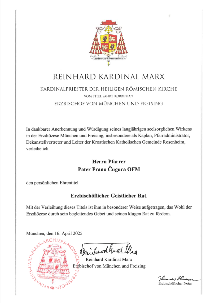 U srijedu 16.04.2025.u okviru proslave mise krizme i svećničkog dana nadbiskupije München-Freising, münchenski nadbiskup Reinhard kardinal Marx odlikovao je četvoricu svećenika počasnim naslovom „Erzbischöflicher Geistlicher Rat“.