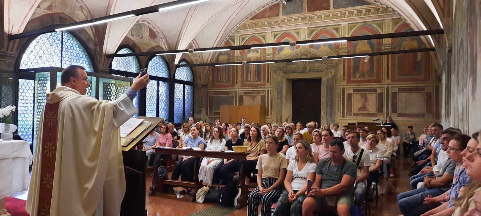 Bazilika svetog Antuna ima ukupno pet klaustara. Jedan od njih je „Klaustar Magnolije“ („Chiostro della Magnolia“), koji svoje ime duguje ogromnoj magnoliji u sredini travnjaka. Klaustar se zove i Kapitulski („del Capitolo“) jer se na strani izlaza iz bazilike nalazi velika dvorana kapitula, nekoć rezervirana za sastanke braće, a sada pretvorena u kapelu. U njoj smo u 11.00 sati imali svetu misu koju je za nas hodočasnike predvodio fra Petar.