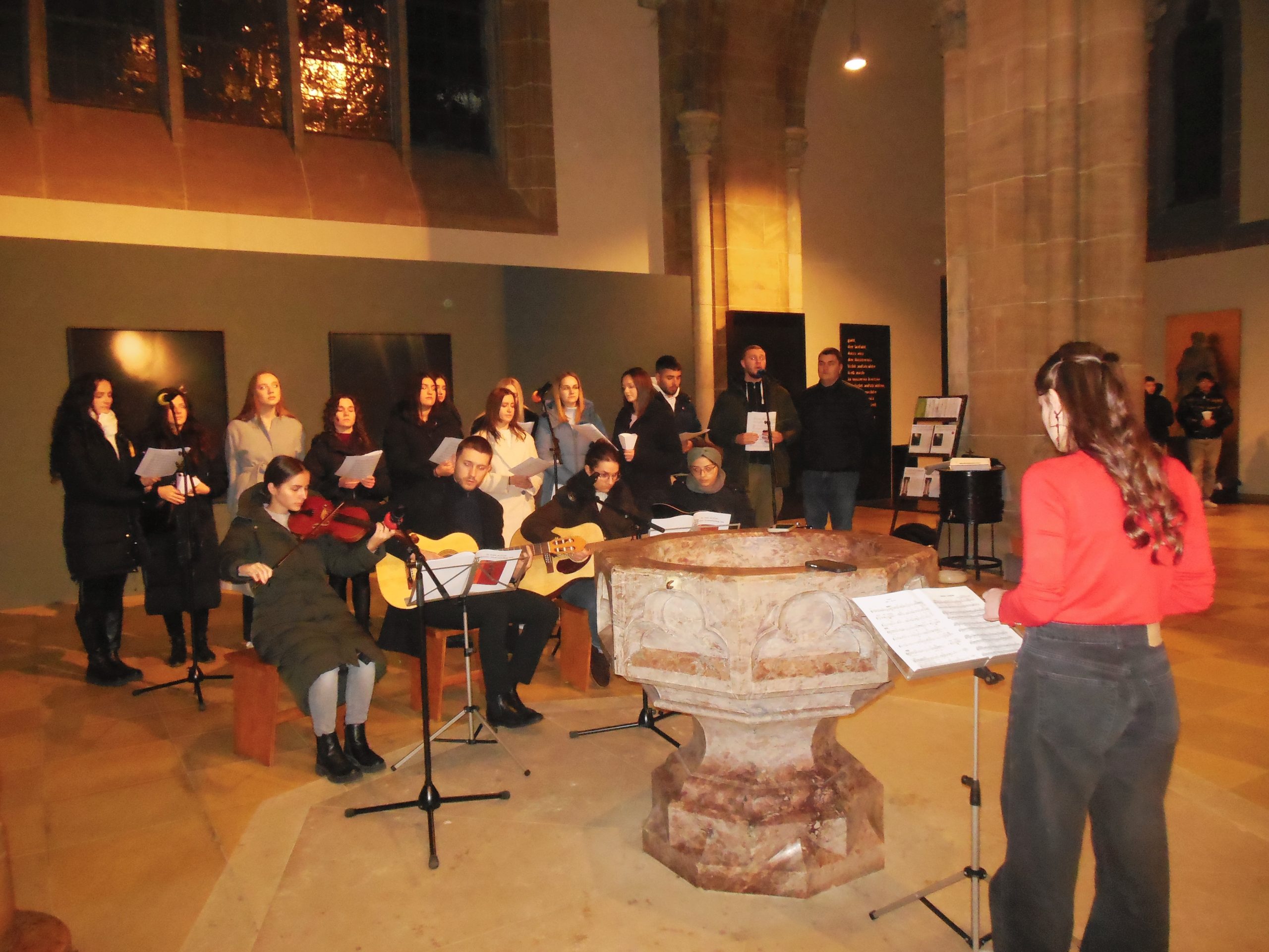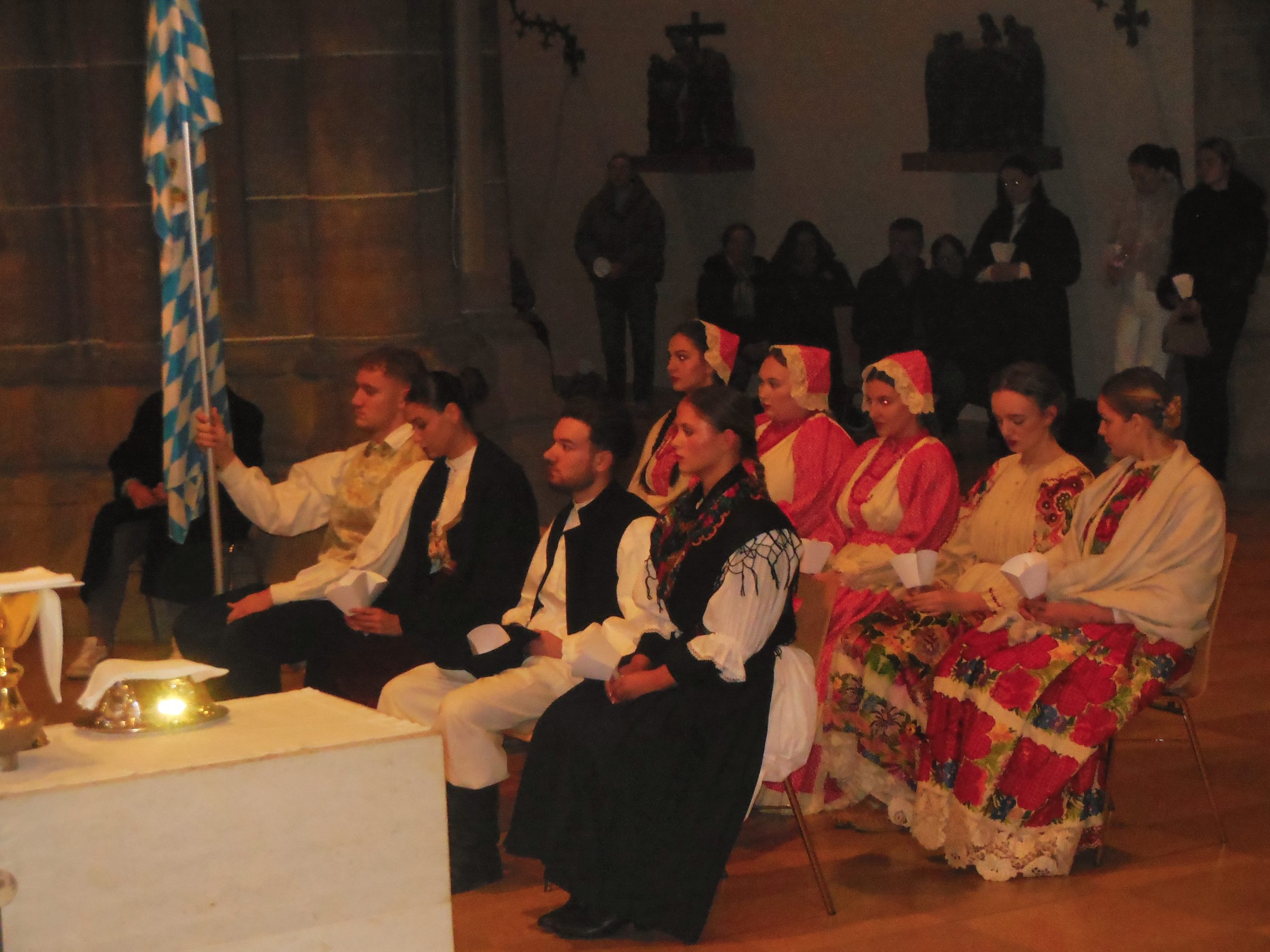 Oko oltara ministranti, folkloraši, zbor mladih predvođen s. Nikolinom Bilić. Zaboravlja se na hladnoću kad je zapjevala cijela crkva. A pjevalo se latinski i hrvatski. Pjevana misa približavala nas je nebeskoj Crkvi u kojoj su naši dragi, preminuli i ubijeni, a putujuća Crkva, to smo mi koji se  kroz pjesmu Gospi, Domovini i Isusu Kristu, međusobno povezasmo i nakon pročitane Božje riječi osluškivali smo što će nam Bog poručiti po propovjedniku don  Darku Poljaku.