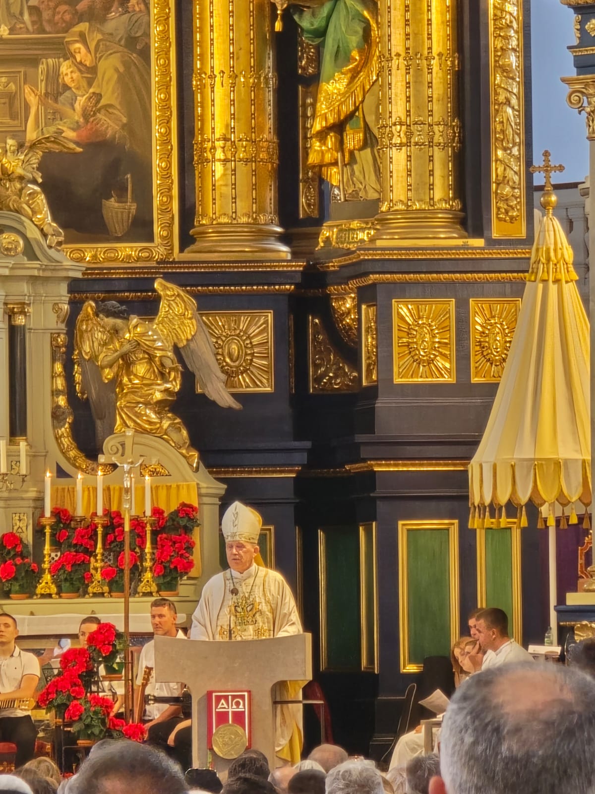 Nadbiskup je na početku propovijedi zahvalio svima koji su omogućili hodočašće Majci Božjoj kako bi hrvatski hodočasnici mogli zajedno doći pred nju i iznijeti joj svoje potrebe. Iznio je vjernicima pozdrave u ime svih biskupa Hrvatske i Bosne i Hercegovine te u ime Vijeća za inozemnu pastvu. Posebno je naglasio važnost svećenika, časnih sestara, socijalnih radnika i drugih pomoćnika koji djeluju u hrvatskim katoličkim zajednicama radi duhovnoga dobra vjernika, radi slave Božje i radi širenja Božje volje u današnjem svijetu. Redovita nedjeljna okupljanja hrvatskih vjernika na euharistijskim slavljima su ono što naše vjernike izvan Domovine karakterizira i što je za svaku pohvalu. Naglasio je posebno važnost nasljedovanja primjera svetaca, a na osobit način Majke Božje.