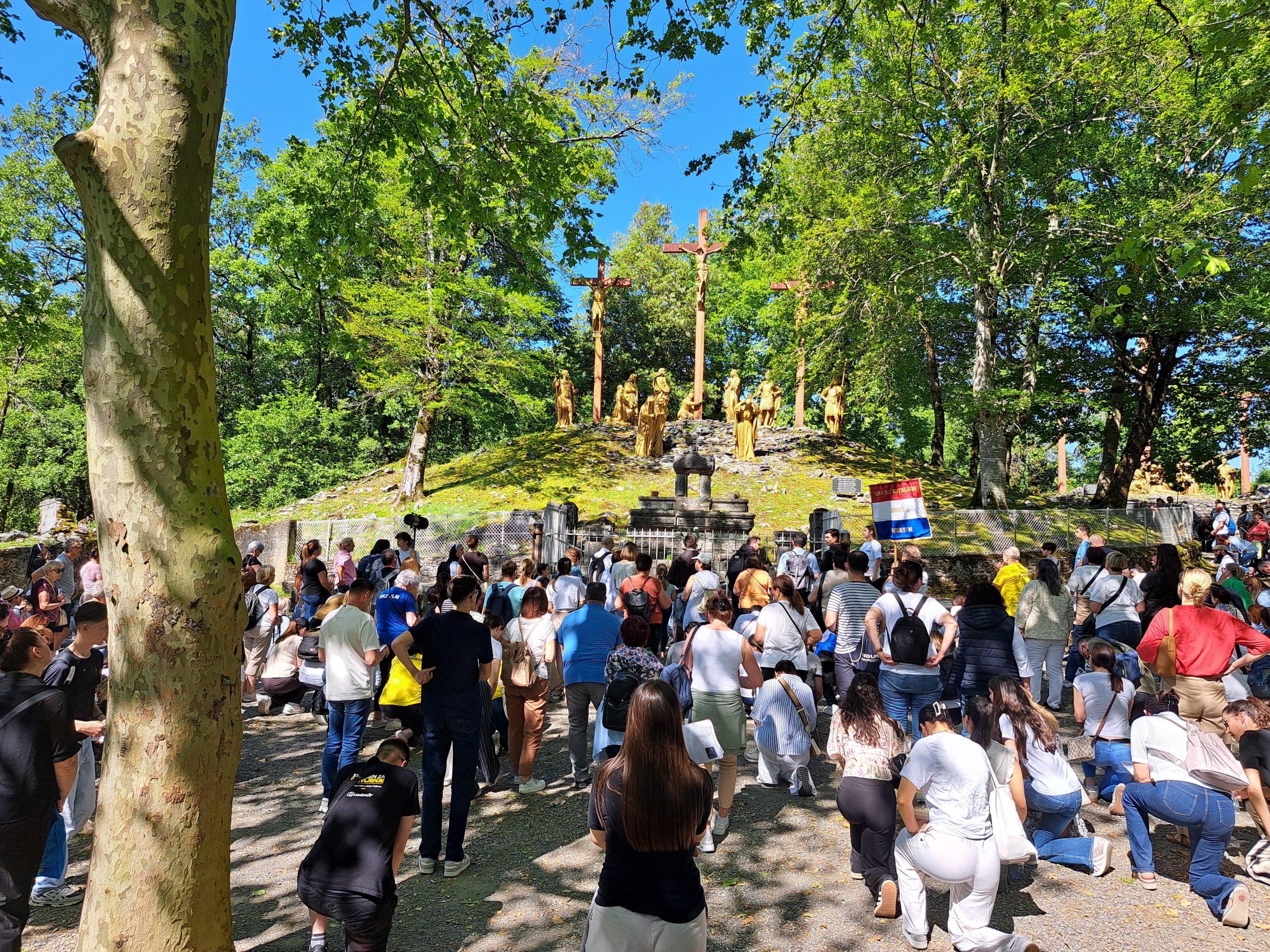 Tijekom mise liturgijsko je pjevanje predvodio veliki zbor sastavljen od pjevača iz različitih hrvatskih misija, dok je za orguljama svirala s. Pavlimira. Nakon svete mise upriličeno je ispred lurdske bazilike tradicionalno zajedničko fotografiranje svih okupljenih hrvatskih vjernika. Potom su se hodočasnici uputili prema brdu Kalvarija, gdje je uslijedila pobožnost križnoga puta koju su predvodili svećenici iz nekoliko hrvatskih misija. U dostojanstvenoj i dojmljivoj povorci, brojni vjernici – od kojih su neki hodali bosi – koračali su od postaje do postaje i u svojim molitvama sjedinjavali vlastite životne patnje i križeve s Kristovim putem, pronalazeći utjehu i snagu u njegovoj žrtvi.