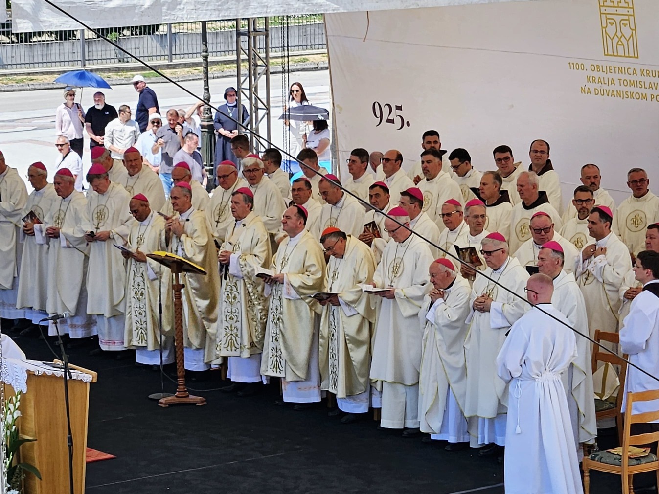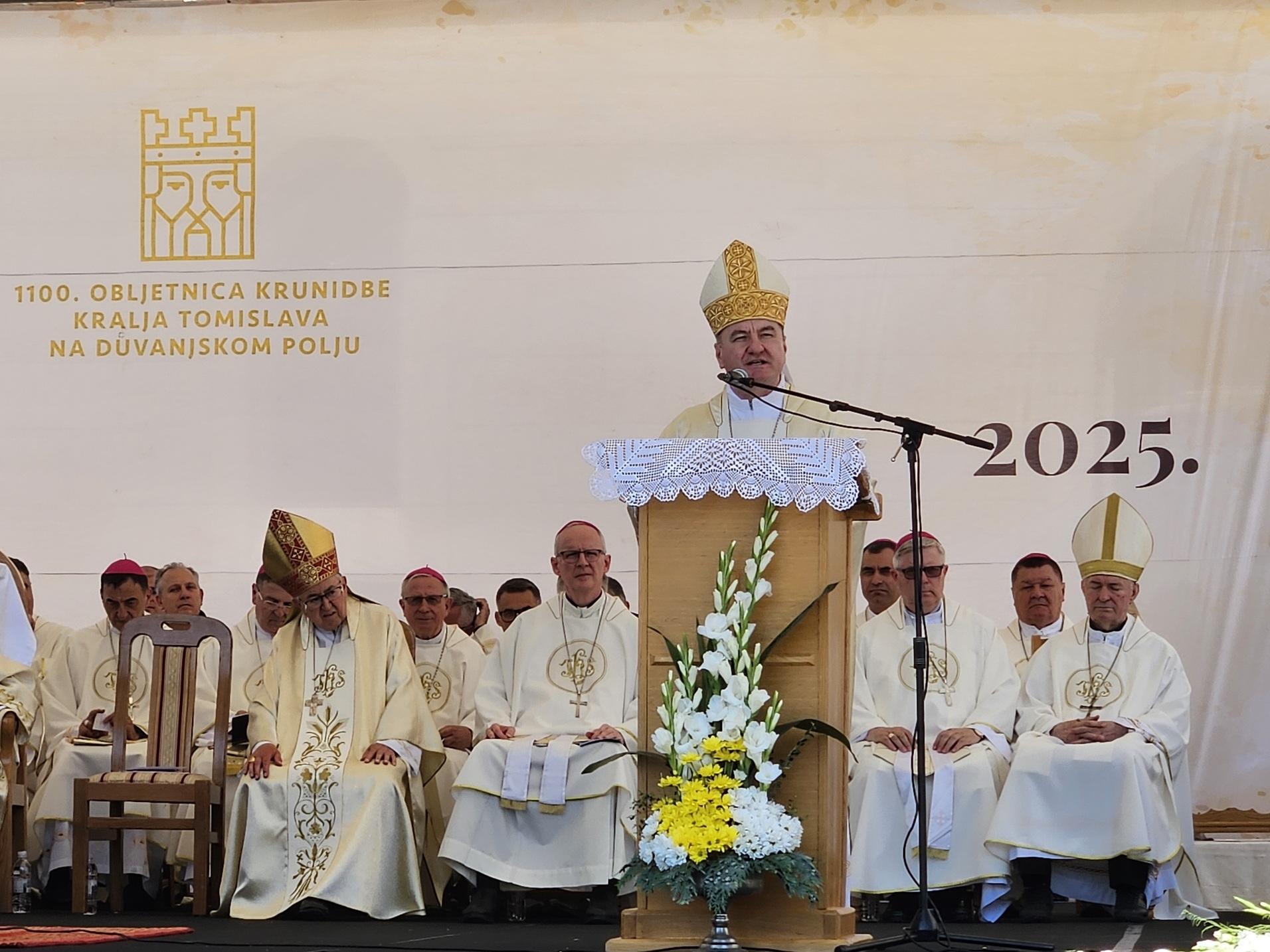Propovijedao je predsjednik Hrvatske biskupske konferencije zagrebački nadbiskup Dražen Kutleša. U propovijedi se osvrnuo na krunidbu kralja Tomislava, istaknuvši da je ona bila „vidljiv znak i trajan zalog nade svoje budućnosti“. „Danas stojimo na svetom mjestu, pokraj spomen-crkve koju je hrvatski narod odlučio podići u povodu tisućite obljetnice krunidbe kralja Tomislava kao vidljiv znak i trajan zalog nade svoje budućnosti. Taj čin nije bio tek simboličan ni protokolaran; bio je to duhovni čin pamćenja, prisjećanje na ukorijenjenost hrvatskoga naroda u kršćansku vjeru koja je srce kulture, u baštinu koja nas je oblikovala tijekom stoljeća. To je bio spomen-čin naroda koji je svoju budućnost odlučio povjeriti Bogu i Crkvi; naroda koji je tada, kao što to činimo i mi danas, svjesno izabrao živjeti ne samo u zemaljskoj slobodi, nego u svjetlu Božje istine koja oslobađa i daje smisao svemu“, rekao je nadbiskup Kutleša.