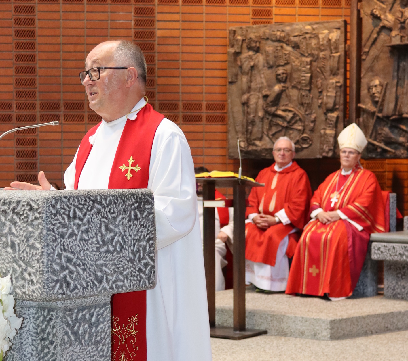 Pozdravnu i zahvalnu riječ mons. Hraniću je uime vjernika te misije uputio Gerald Šaravanja. „Naši su očevi i djedovi dolazili ovamo raditi i zaraditi za svoje brojne obitelji. Nisu znali njemački jezik, a suočavali su se s tuđinom, osamljenosti i drugim poteškoćama. Upravo je ova crkva sagrađena za prognane Nijemce i Poljake. Danas se mi Hrvati u njoj okupljamo i slavimo Boga. Naši hrvatski biskupi su od početka odlaska našega naroda slali svećenike i osnivali misije, te su pomagali na razne načine našim ljudima. I danas su s nama naši svećenici u našim misijama da bi sačuvali našu vjeru i našu posebnost. Zahvaljujem Vama, oče nadbiskupe, i svim našim biskupima na brizi o nama u tuđini.“