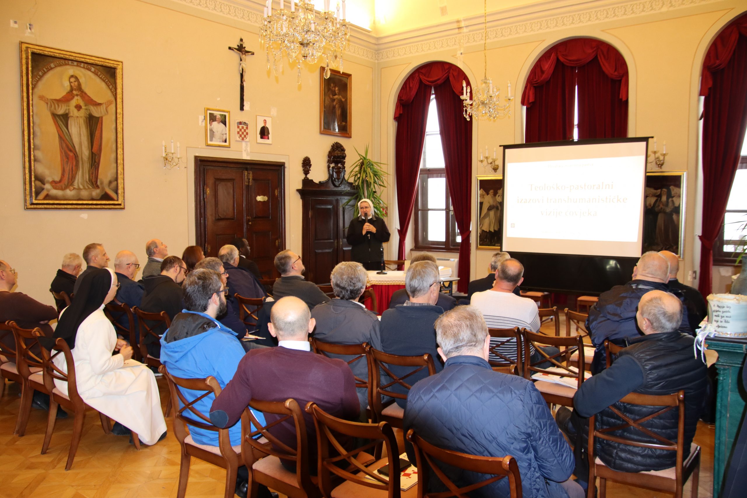 U utorak, 22. listopada su održana tri predavanja. U jutarnjem dijelu programa predavanja su održali dr. sc. Odilon Singbo i dr. sc. Suzana Peran. Dr. Singbo je održao predavanje na temu „Teološko-pastoralni izazovi transhumanističke vizije čovjeka“. U tom kontekstu, dr. Singbo je govorio o pojmu transhumanizma, koji se pojavio u 20. stoljeću, a definira se kao „intelektualni i kulturni pokret koji afirmira mogućnost i poželjnost suštinskog poboljšavanja ljudskog stanja primjenom razuma i posebno uporabom tehničkih rješenja kako bi se usporilo ili eliminiralo starenje i uvelike poboljšale ljudske intelektualne, fizičke i psihološke sposobnosti.“ Kao dva ključna izazova u kontekstu transhumanizma dr. Odilon Singbo je naveo moć umjetne inteligencije i rodno-ideološki narativ – pitanje rodne disforije, iza koje se krije tehnokratska paradigma. Transhumanizam pomoću umjetne inteligencije želi preobraziti društvo i promijeniti čovjeka, a kroz različite “trans“ izaziva situaciju transmanije pa tako se javljaju pojave poput transrasna što je osjećaj pripadnosti drugoj rasi; transvrsna što bi bio križanac čovjeka i životinje te transdobna što označava osjećaj druge životne dobi. Na kraju se dr. Singbo, osvrćući se na umjetnu inteligenciju rekao: Neodvojivost Adamova daha života i praha zemaljskog pokazuje svu uzvišenost čovjeka nad umjetnom inteligencijom. U konačnici, umjetnu inteligenciju se ne može smatrati osobom“, zaključio je svoje predavanje dr. sc. Odilon Singbo.