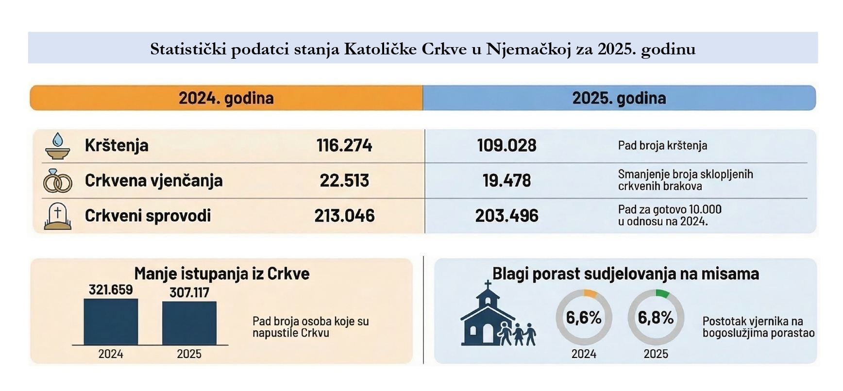 U ponedjeljak, 16. ožujka, Njemačka biskupska konferencija je objavila crkvenu statistiku za 2025. godinu. Statistički podatci obuhvaćaju dvadeset i sedam njemačkih (nad)biskupija Katoličke Crkve u Njemačkoj, objavila je službena stranica Njemačke biskupske konferencije.